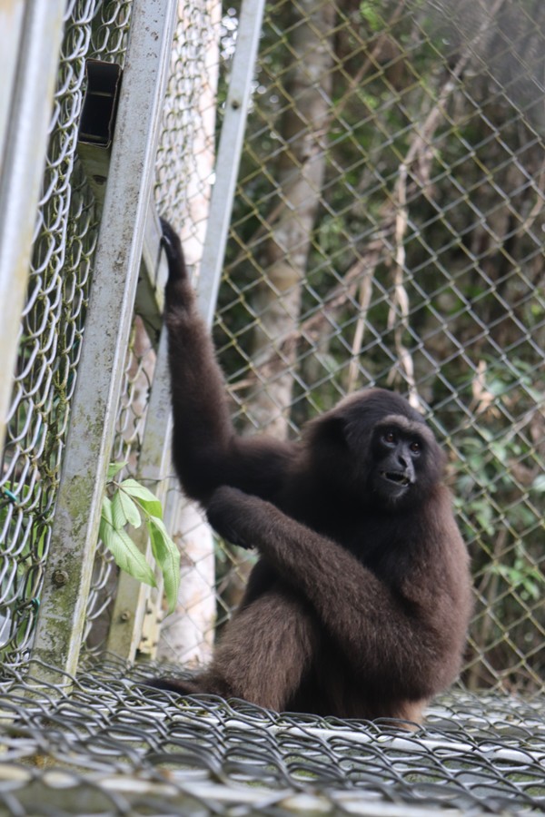 Ce matin nuageux, Konut a alterné montées, descentes et suspensions, observant tour à tour le sol et le plafond de sa cage. Par moments, elle se balançait doucement, tandis que les chants des autres gibbons résonnaient encore dans l’air. .
