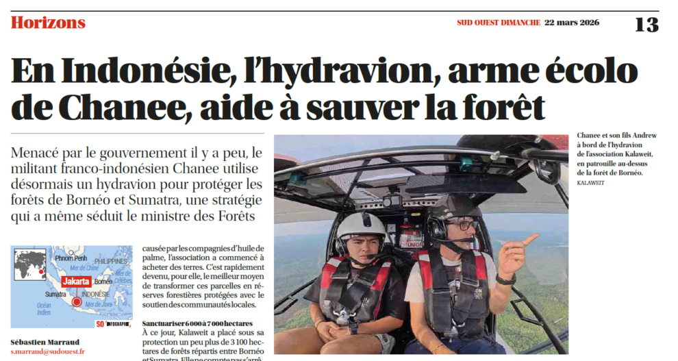 En Indonésie, l’hydravion arme écolo de Chanee, aide à sauver la forêt.